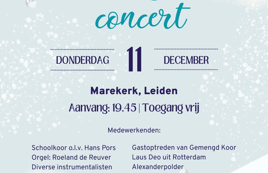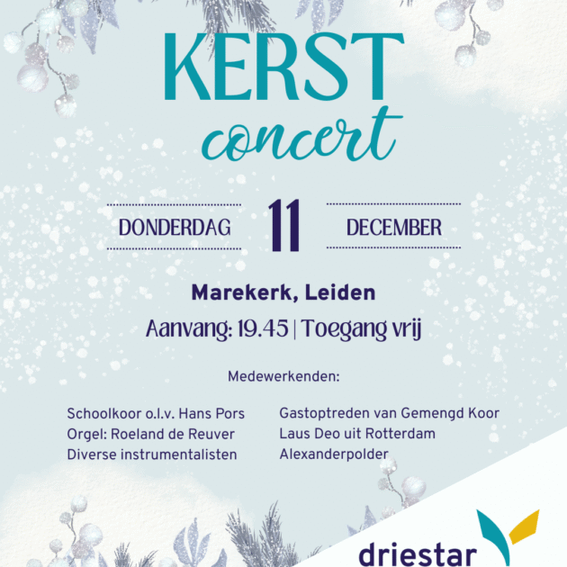 Op D.V. donderdagavond 11 december organiseert Driestar Leiden een kerstconcert in de Marekerk te Leiden. Het belooft een geweldige avond te worden waar veel leerlingen hun medewerking aan verlenen. Er zullen optredens verzorgd worden door het schoolkoor en diverse leerlingen die met instrumentale bijdragen hun muzikale talenten laten horen. Ook zal er een gastoptreden zijn van gemengd koor Laus Deo uit Rotterdam. Net als vorig jaar zal een interactief moment niet ontbreken. Het orgel wordt bespeeld door Roeland de Reuver. Het concert begint om 19.45 uur en de toegang is gratis. Iedereen van harte uitgenodigd om dit muzikale event mee te maken. Welkom!